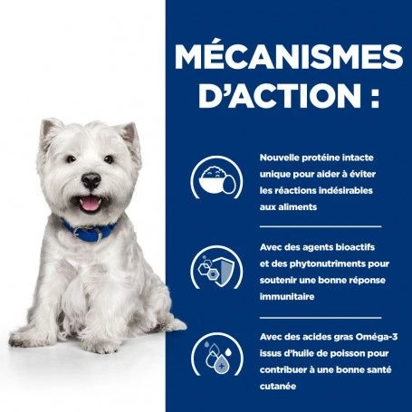 Les croquettes Hill’s PRESCRIPTION DIET Derm Complete Mini sont u00e9laboru00e9es pour les petits chiens ayant des allergies alimentaires et environnementales.